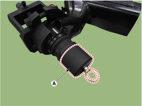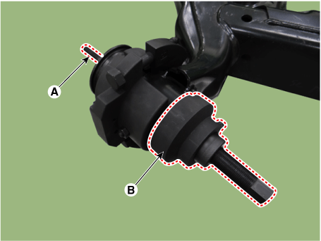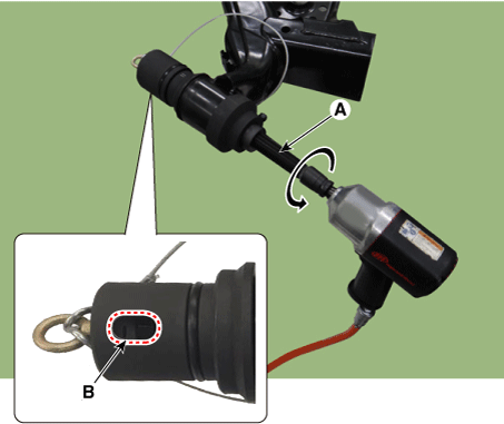 Снимите втулку, повернув основной болт (А) против часовой стрелки с помощью с помощью пневматического гайковерта. В этой процедуре проверьте, ослабляется ли гайка визуально через отверстие крышки (В). И если гайка ослабевает, то подтяните ее регулируемым крутящий момент.