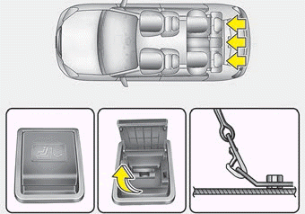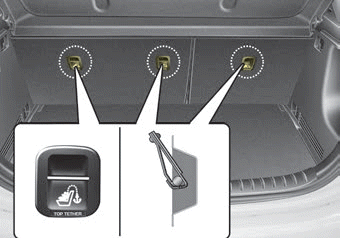 Держатели крючков для детских удерживающих устройств расположены на лотке для упаковки (4 двери) или на пол за задним сиденьем (5 Door).