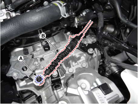 Снимите фиксатор троса переключения передач (А) после ослабления гаек (В). Затем, снимите трос переключения передач, потянув его в сторону салона автомобиля.