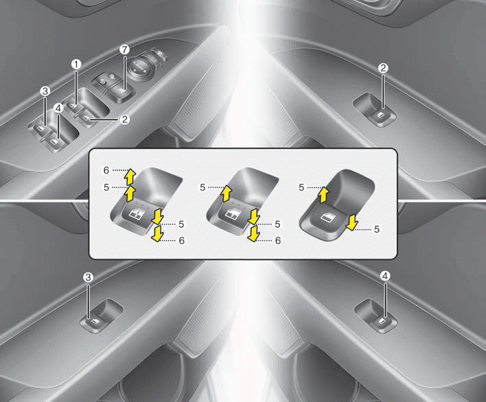 Каждая дверь имеет переключатель электрического стеклоподъемника, который управляет стеклоподъемником двери. Водитель