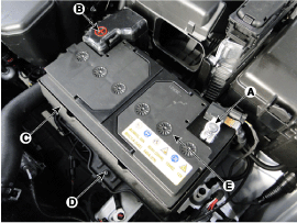 Снимите монтажный кронштейн аккумулятора (D) и изоляционную прокладку (C), а затем снимите аккумулятор (E).