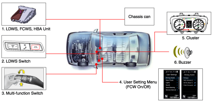 Компоненты 1. Переключатель LDWS ВКЛ/ВЫКЛ2. Комбинация приборов3. блок LDWS ...