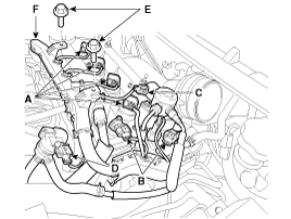 Отсоедините разъем датчика температуры охлаждающей жидкости двигателя (В).
