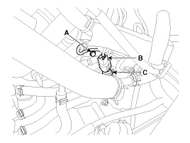 Снимите датчик температуры охлаждающей жидкости двигателя (С).