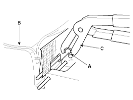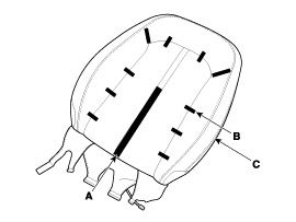Снимите липучку (A) и зажимы (B) на передней части спинки сиденья и снимите обивку спинки переднего сиденья (C).