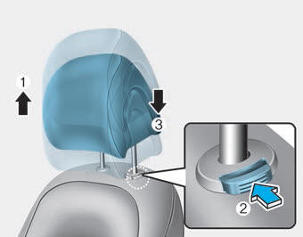 1. Нажмите и удерживайте кнопку фиксатора (2) на опоре подголовника.