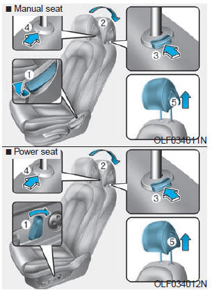 3. Нажмите кнопку разблокировки подголовника (3) и отверстие для доступа (4) с инструмент (например, булавку), потянув подголовник вверх (5).