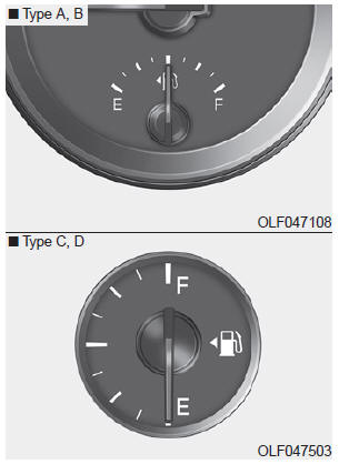 Закончившееся топливо может подвергнуть опасности пассажиров автомобиля. Вы должны остановиться и получите дополнительное топливо как можно скорее после того, как загорится сигнальная лампа или когда индикатор манометра приближается к отметке «E (Пустой)».