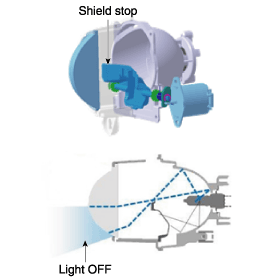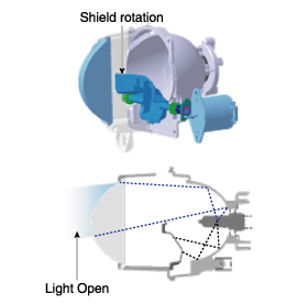 : Свет не блокируется открытым щитком, и свет освещает область дальнего света.