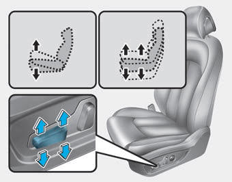 Переднее сиденье можно отрегулировать с помощью переключателей, расположенных снаружи. подушки сиденья. Перед началом движения установите сиденье в правильное положение, чтобы вы можете легко управлять рулем, педалями и элементами управления на приборе панель.