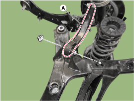 Ослабьте болт и гайку, затем снимите задний верхний рычаг (А) с подрамником.