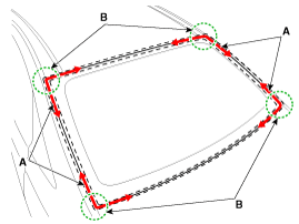 Удалите герметик (В) с помощью ножа (А) с панели кузова.
