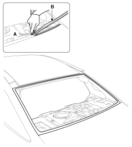 Удалите герметик (В) с помощью ножа (А) со стекла заднего стекла.