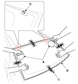Используйте присоски (A), чтобы удерживать стекло заднего стекла (B) над