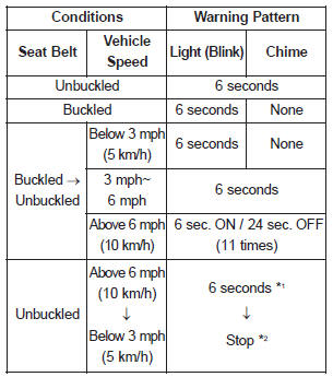 Сигнализатор непристегнутого ремня безопасности водителя и звуковой сигнал загорятся в следующей таблице, когда ключ зажигания находится в положении ON.