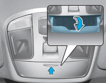 Нажмите на крышку, и держатель медленно откроется. Поместите солнцезащитные очки в дверь отсека линзами наружу.
