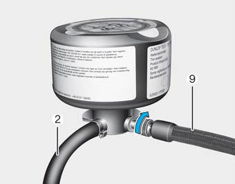 2. Навинтить соединительный шланг (9) на штуцер баллона с герметиком.