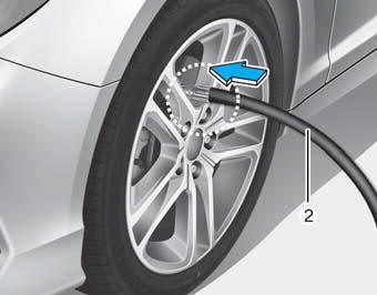 4. Отвинтите колпачок клапана с вентиля спущенной шины и закрутите начинку. шланг (2) баллона с герметиком на клапан.