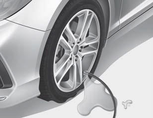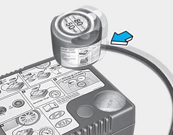 8. Когда ключ зажигания находится в положении ON, включите компрессор и дайте ему поработать примерно 5-7 минут, чтобы заполнить герметиком до надлежащего давления. (см. «Шины и колеса», глава 8). Давление в шине после заполнение несущественно и будет проверено/исправлено позже.