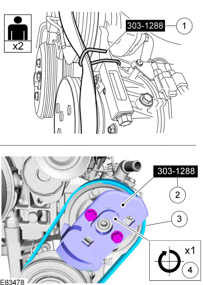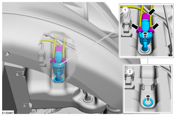 На иллюстрации сноски обозначают последовательность удаления, который перевернут для установки . Желтая окраска шланга указывает на то, что его следует расположить в стороне. (не снято). Обозначены два одинаковых (пурпурного цвета) крепежа. по стрелке x2. Крепления на этом рисунке требуют разных крутящий момент (одинаковый крутящий момент для крепежа x2), поэтому используются пронумерованные сноски чтобы идентифицировать их значениями крутящего момента в соответствующем тексте шага. (пурпурного цвета) хомут для шланга — это еще одна застежка, которую необходимо снять.