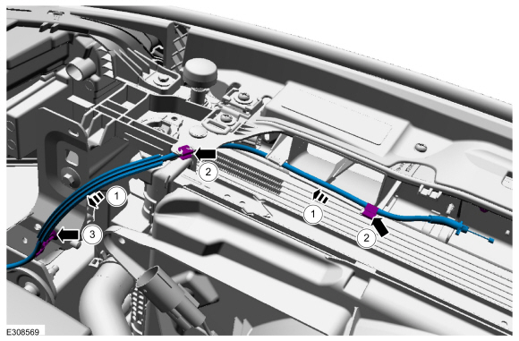 Прикрепите зажимы для прокладки троса открывания замка переднего капота.