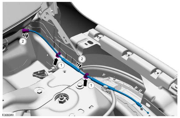 Ford Escape: ручки, замки, защелки и системы входа / Снятие и установка — Трос замка капота