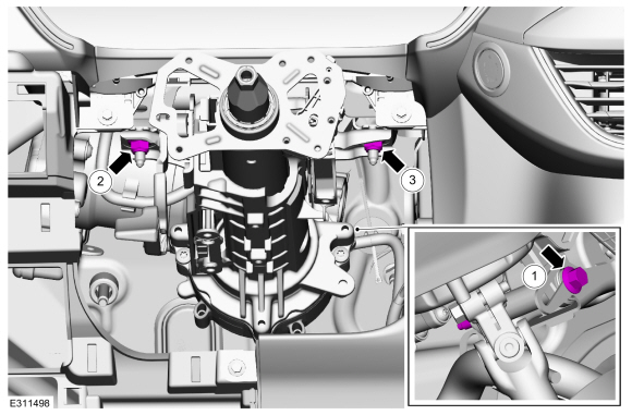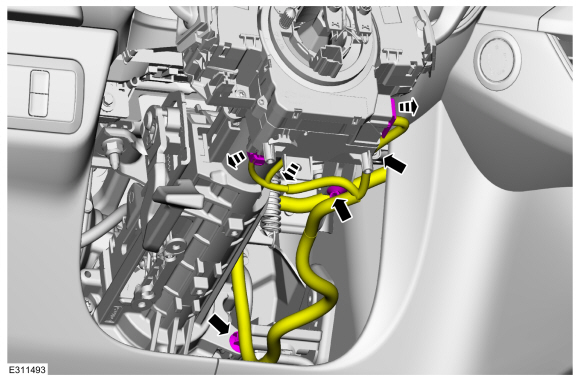 Снимите кожухи рулевой колонки.УВЕДОМЛЕНИЕ: Не позволяйте рулевому колесу вращаться во время вал рулевой колонки отсоединен или может быть повреждена часовая пружина. результат. Если есть признаки того, что вал вращался, снимите и центрировать часовую пружину.