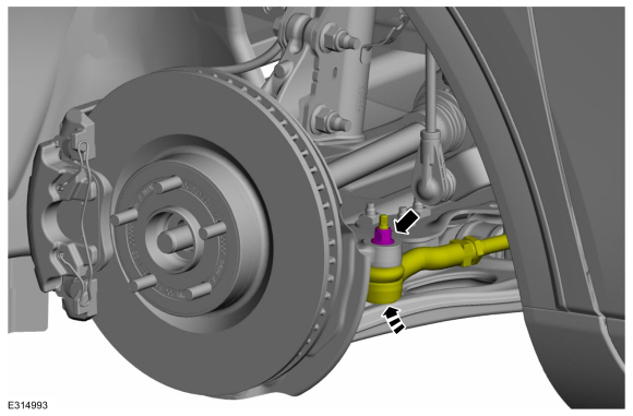 УВЕДОМЛЕНИЕ: Не используйте молоток, чтобы отделить конец рулевой тяги от может привести к повреждению поворотного кулака или повреждению поворотного кулака.