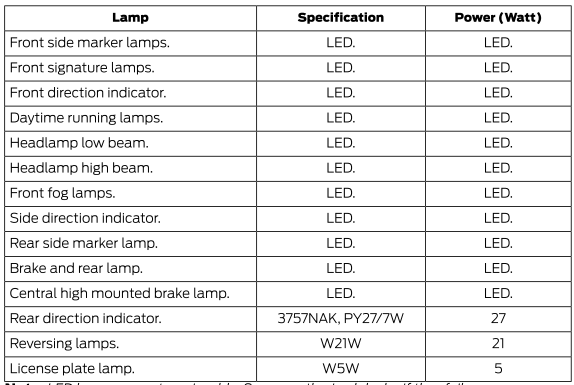Сменные лампы указаны в таблице ниже. Лампы фар должны быть маркированы с авторизованным D.O.T. маркировка для Северной Америки, чтобы убедиться, что они имеют надлежащее производительность лампы, яркость света, световой узор и безопасная видимость. Верное лампочки не повредят лампу в сборе и не аннулируют гарантию на лампу. обеспечивают качественное время освещения лампы.