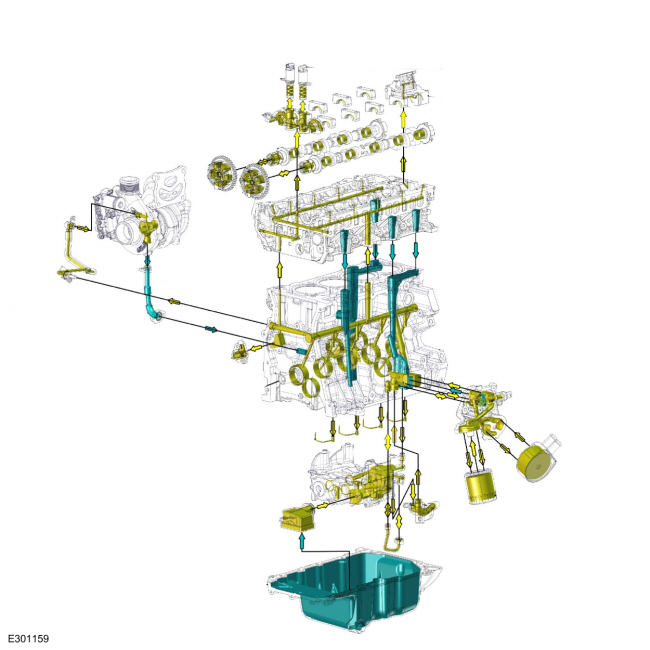 система смазки двигателя нагнетательная, масло подается подается под полным давлением на коленчатый вал, шатунные вкладыши, натяжители цепи ГРМ, крышки подшипников распредвалов и VCT соленоиды. Поток масла к толкателям клапанов и клапанному механизму регулируется ограничительным отверстием, расположенным в прокладке головки блока цилиндров.