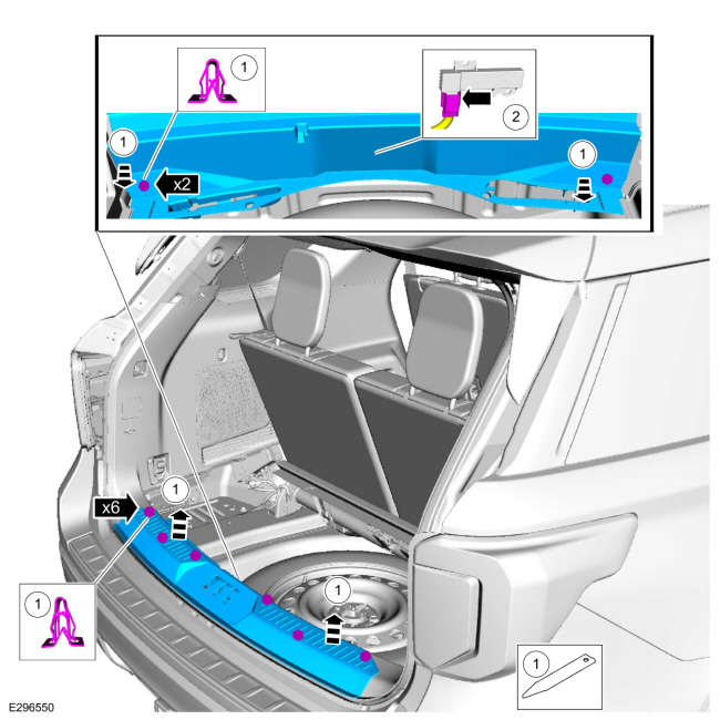 Освободите фиксаторы панели облицовки накладки порога двери багажного отделения.