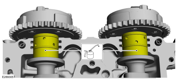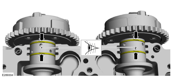 УВЕДОМЛЕНИЕ: Установите распределительные валы с установочными пазами в распределительные валы выровнены, чтобы можно было установить выравнивающую пластину распределительного вала без вращения распределительных валов. Убедитесь, что лепестки на № 1 цилиндр находится в том же положении, что и в процедуре снятия. Вращение распределительных валов при снятой цепи ГРМ или установка распредвалы, сдвинутые на 180 градусов, могут привести к серьезному повреждению клапана и поршни.