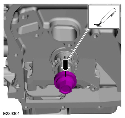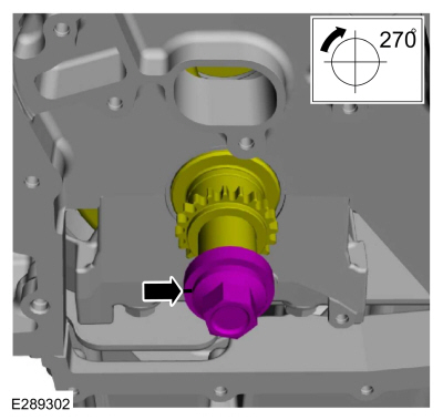 Используя болт коленчатого вала и шайбу, поверните коленчатый вал по часовой стрелке на 270 градусов, пока метка краски не окажется на отметке 9 часовая позиция.