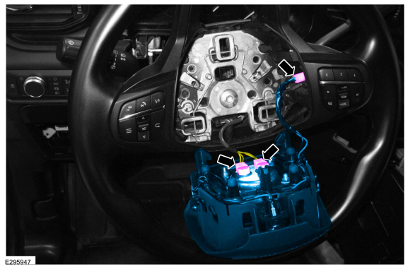 Отсоедините электрические разъемы подушки безопасности водителя и снимите подушку безопасности водителя.