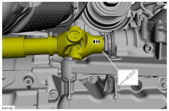 Используйте инструмент, чтобы отсоединить стопорное кольцо, удерживающее вилка переднего карданного вала к штоку шестерни переднего моста.