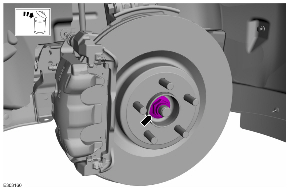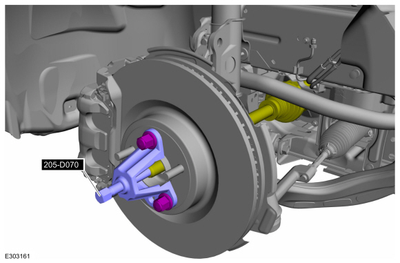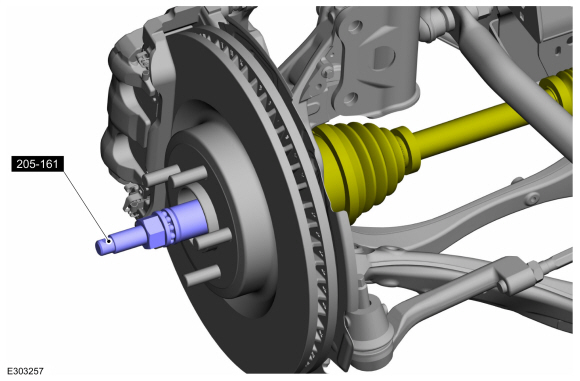 УВЕДОМЛЕНИЕ: Не затягивайте гайку ступицы переднего колеса автомобиль на земле. Гайка должна быть затянута в соответствии со спецификацией перед автомобиль опускается на колеса. Произойдет повреждение ступичного подшипника если ступичный подшипник нагружается весом автомобиля.