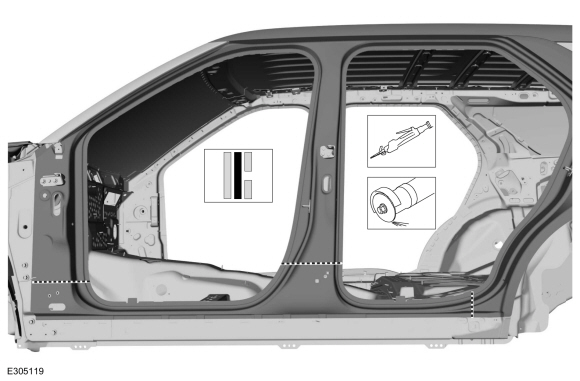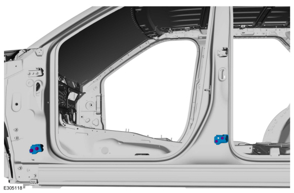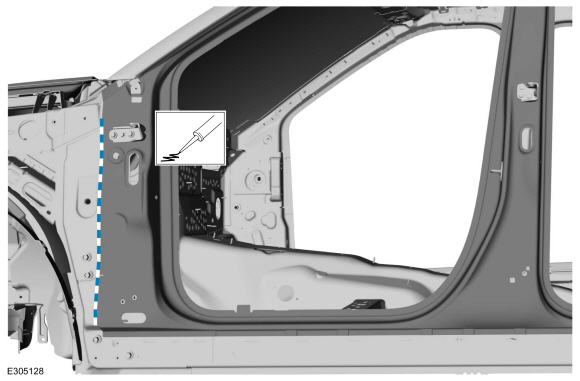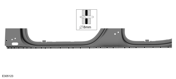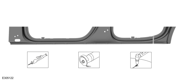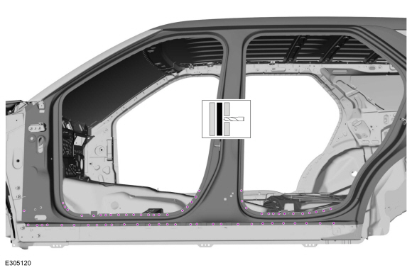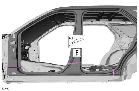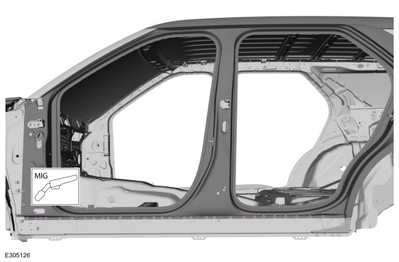 ПРИМЕЧАНИЕ: Заводские сварные швы могут быть заменены контактными точечными швами или сварка электродами в среде инертного газа (MIG). Точечная сварка сопротивлением не может быть размещается непосредственно над исходным местоположением. Они должны располагаться рядом с исходное расположение и равные по количеству заводские сварные швы. Металлический инертный газ Сварка электрозаклепками (MIG) должна соответствовать заводской сварке как по расположению, так и по количеству.