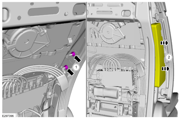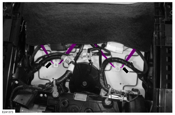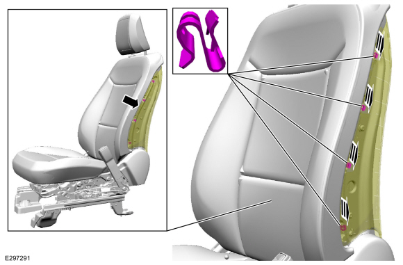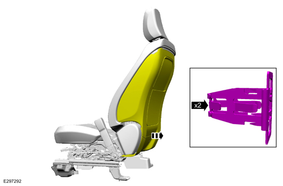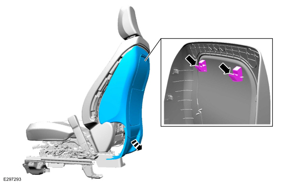 С обеих сторон возьмитесь за панель спинки переднего сиденья, где он соответствует окантовке модуля, потяните, чтобы освободить зажимы и отделить панель спинки переднего сиденья из обшивки модуля.