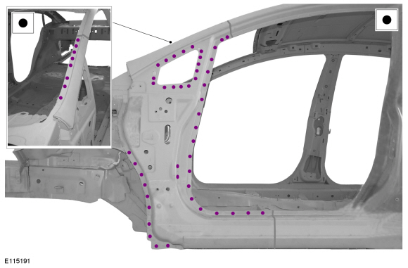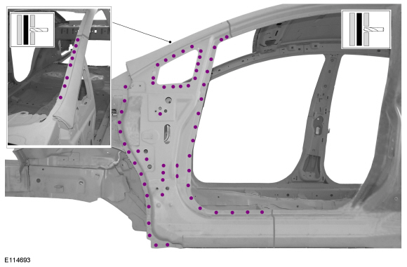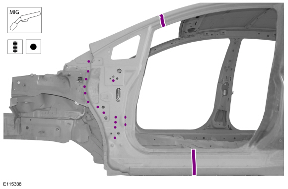 Приварите точечной сваркой часть дверного проема и область фланца ветрового стекла панели передней стойки.