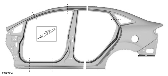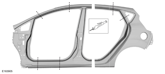 УВЕДОМЛЕНИЕ: Не выполняйте ремонт боковых секций кузова в области дверных петель или точек крепления ответной планки. Сварка в пределах 50 мм (1,96 дюйма) дверных петель или ответных планок могут нарушить конструкцию. целостность при столкновении.