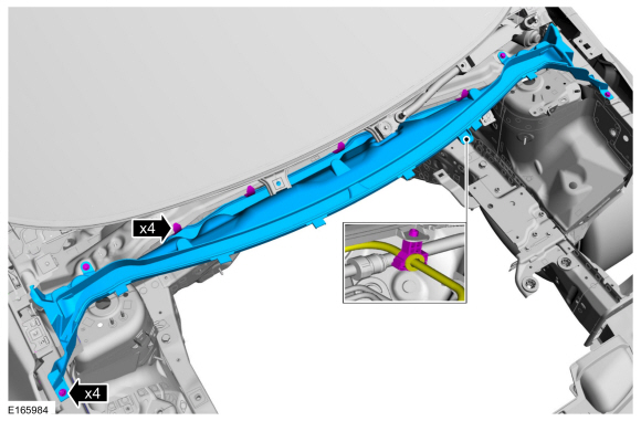 Отсоедините фиксатор шланга омывателя, отверните болты, освободите зажимы и снимите панель капота.