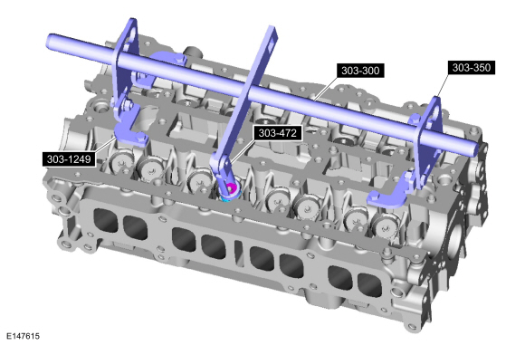 Используйте специальный сервисный инструмент: 303-300 (Т87С-6565-А) Комплект, Компрессор Пружины Клапана. , 303-350 (Т89П-6565-А) Компрессор, клапанная пружина. , 303-472 (Т94П-6565-АХ) Адаптер, компрессор клапанной пружины. , 303-1249 Компрессор клапанной пружины.