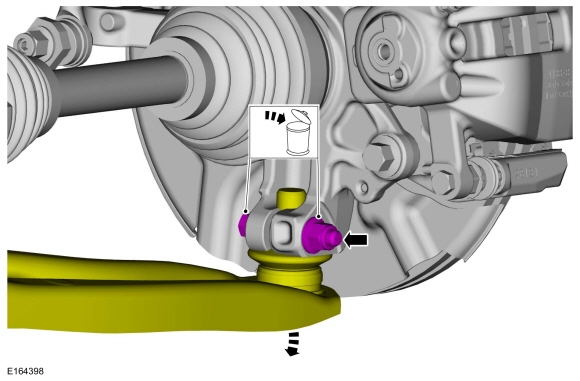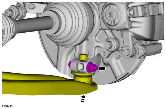 Снимите и выбросьте стяжной болт и гайку шарового шарнира и отделите шаровой шарнир от поворотного кулака.