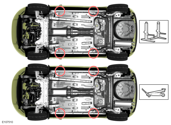 ПРИМЕЧАНИЕ: Точки домкрата и подъема одинаковы для 4-дверного седана и 5-дверного хэтчбека.
