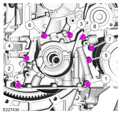 Затяните болты масляного насоса в указанной последовательности в 2 этапа.