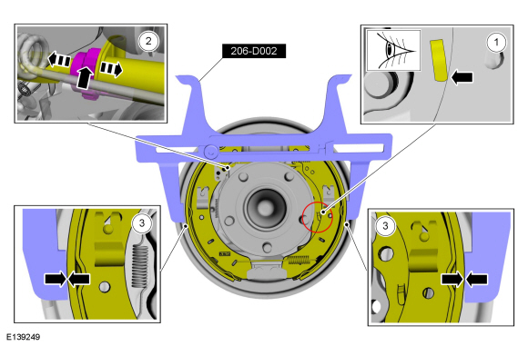 Установите шестигранный ключ на 2 мм между опорой левого рычага стояночного тормоза и тормозной колодкой.