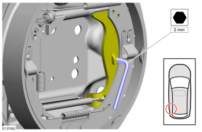 Установите шестигранный ключ на 2 мм между опорой левого рычага стояночного тормоза и тормозной колодкой.