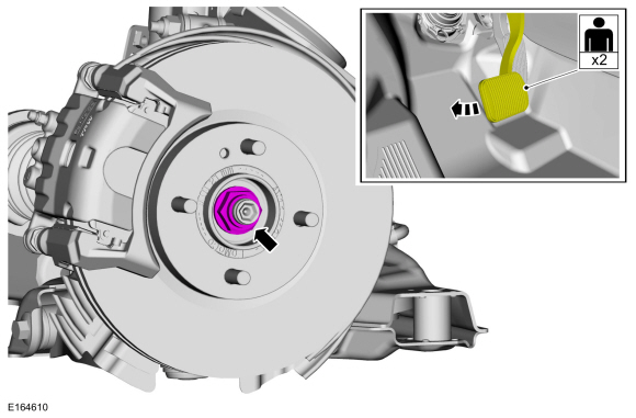 ПРИМЕЧАНИЕ: Включите тормоз, чтобы предотвратить вращение полуоси при ослаблении гайки ступицы колеса.