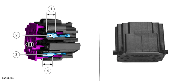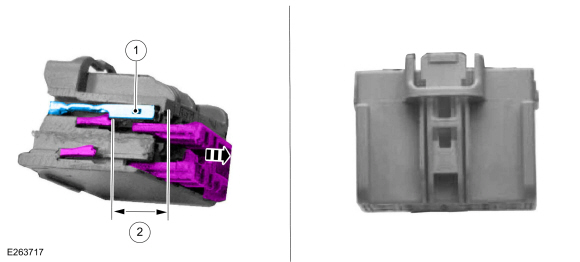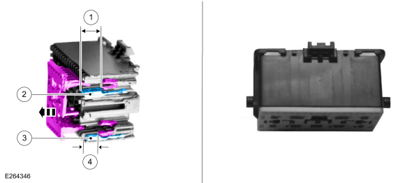 ПРИМЕЧАНИЕ: Информация о жесткой оболочке соединителя, которая измеряется в миллиметрах и представляет собой расстояние от передней поверхности разъема к точке зацепления на выступе фиксатора клеммы. Отметить расстояние, указанное на инструменте для снятия клемм, перед снятием Терминал.