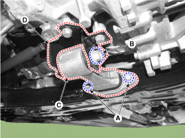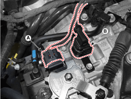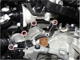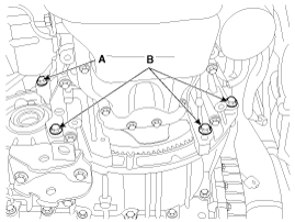 Снимите верхние болты крепления (А-2шт) автоматической коробки передач и болты крепления (В-2шт) стартера.